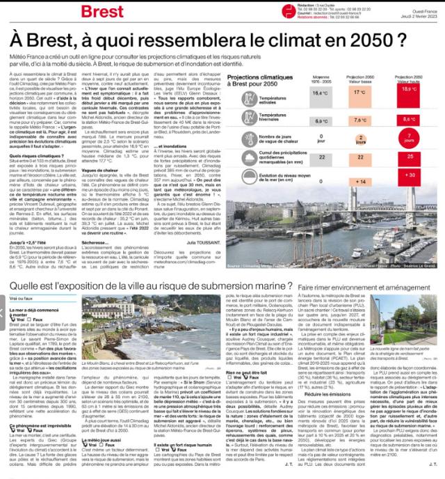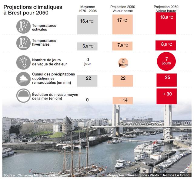 Météo France a créé un outil en ligne pour consulter les projections climatiques et les risques naturels par ville, d’ici la moitié du siècle. "A Brest, le risque de submersion et d’inondation est identifié.